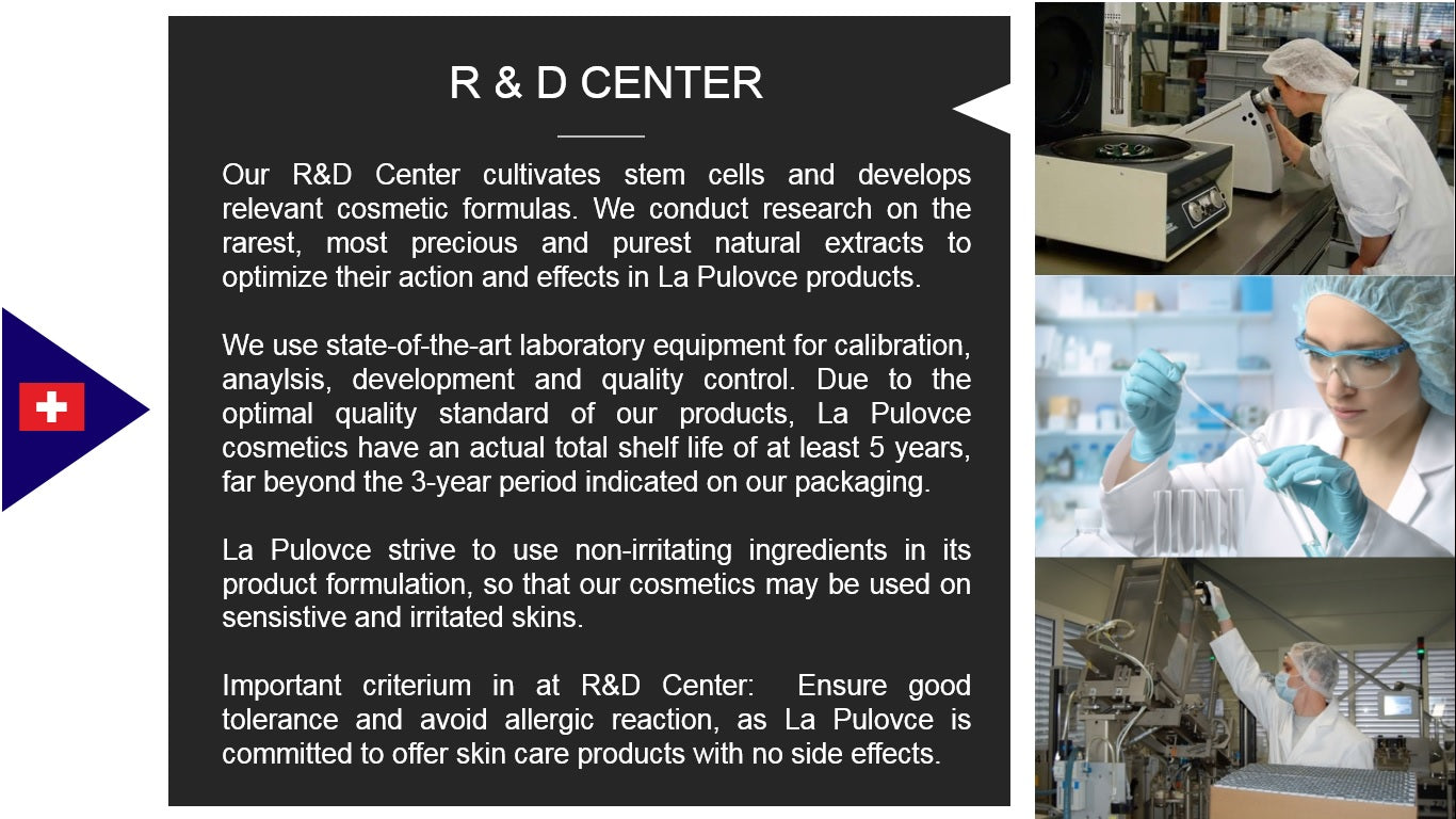 Armed with the most advanced manufacturing equipment and state-of-the-art warehousing facilities, all La Pulovce cosmetics are produced in strict accordance with the Federal regulation and quality standard of Switzerland, one of the highest quality standard for cosmetics in the world.